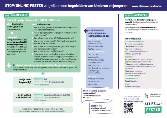Als begeleider of vrijwilliger in jouw sport kan je opvangen dat iemand online gepest wordt. Een jongere kan jou hierover in vertrouwen nemen of hiervan melding maken over iemand anders. Het kan ook zijn dat je dit zelf opmerkt in de chatgroepen gelinkt aan je sport of misschien word je hierover aangesproken door een ouder?